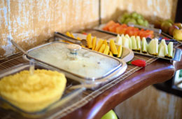 Uma pousada não é completa sem um bom café da manhã. Na Pousada Agua de Fuego oferecemos pão, ovos, presunto, queijo, tapioca, cuscuz, bolo, café, leite, varios tipos de sucos e frutas da estação. Além disso, temos um pequeno restaurante com cardápio variado para fazer uma refeição de sua preferência.